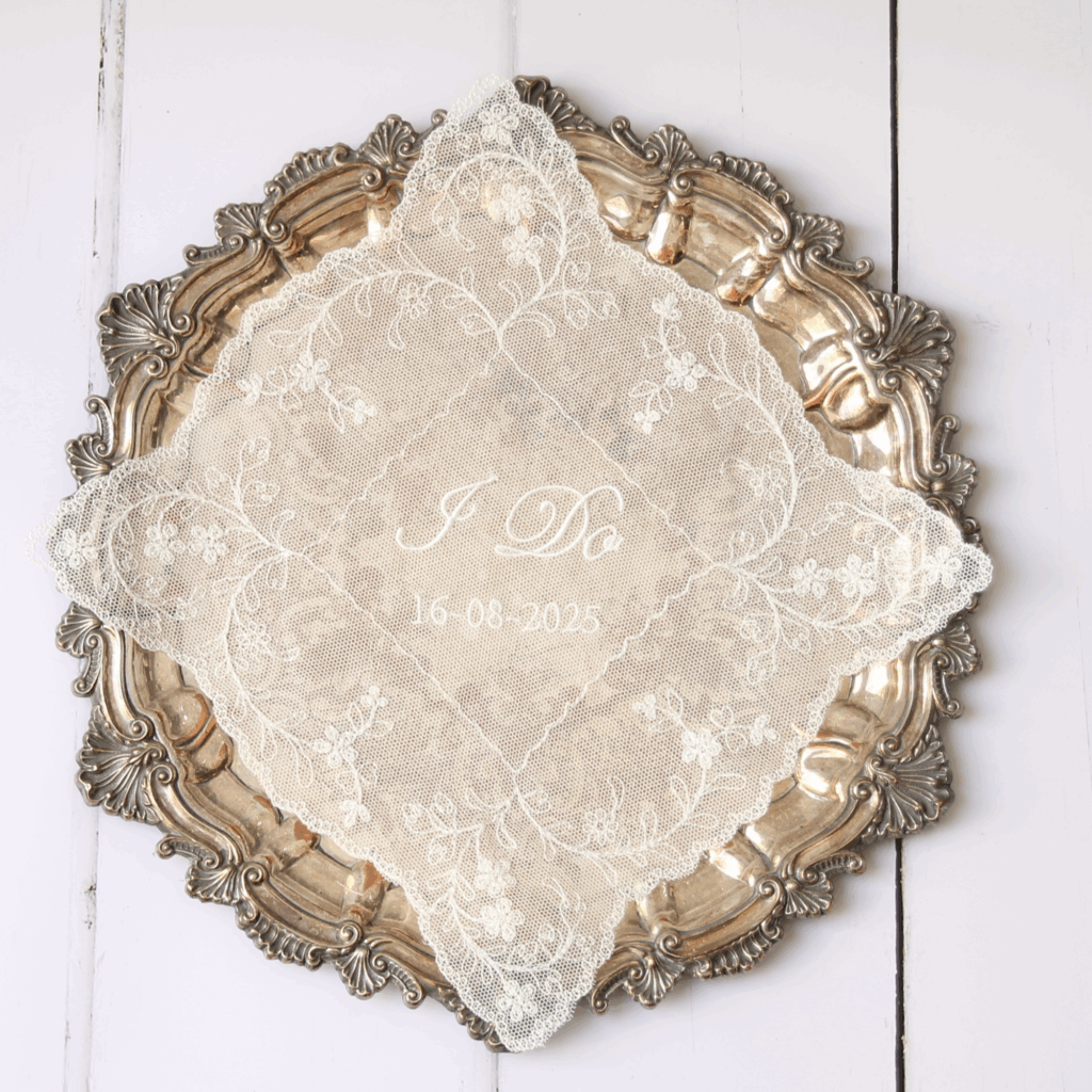 - Embroidered Net Lace Handkerchief – Personalised with ‘I do’ and date
