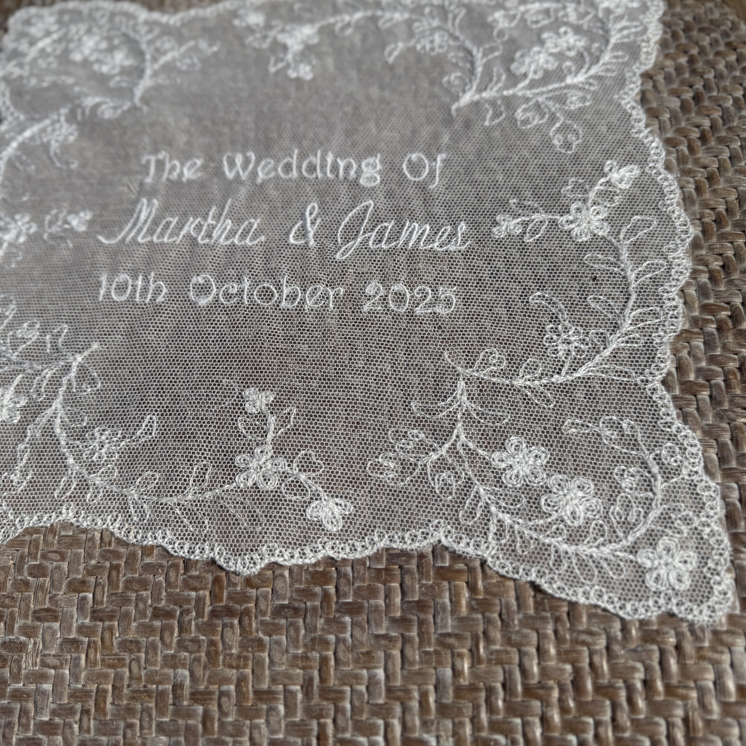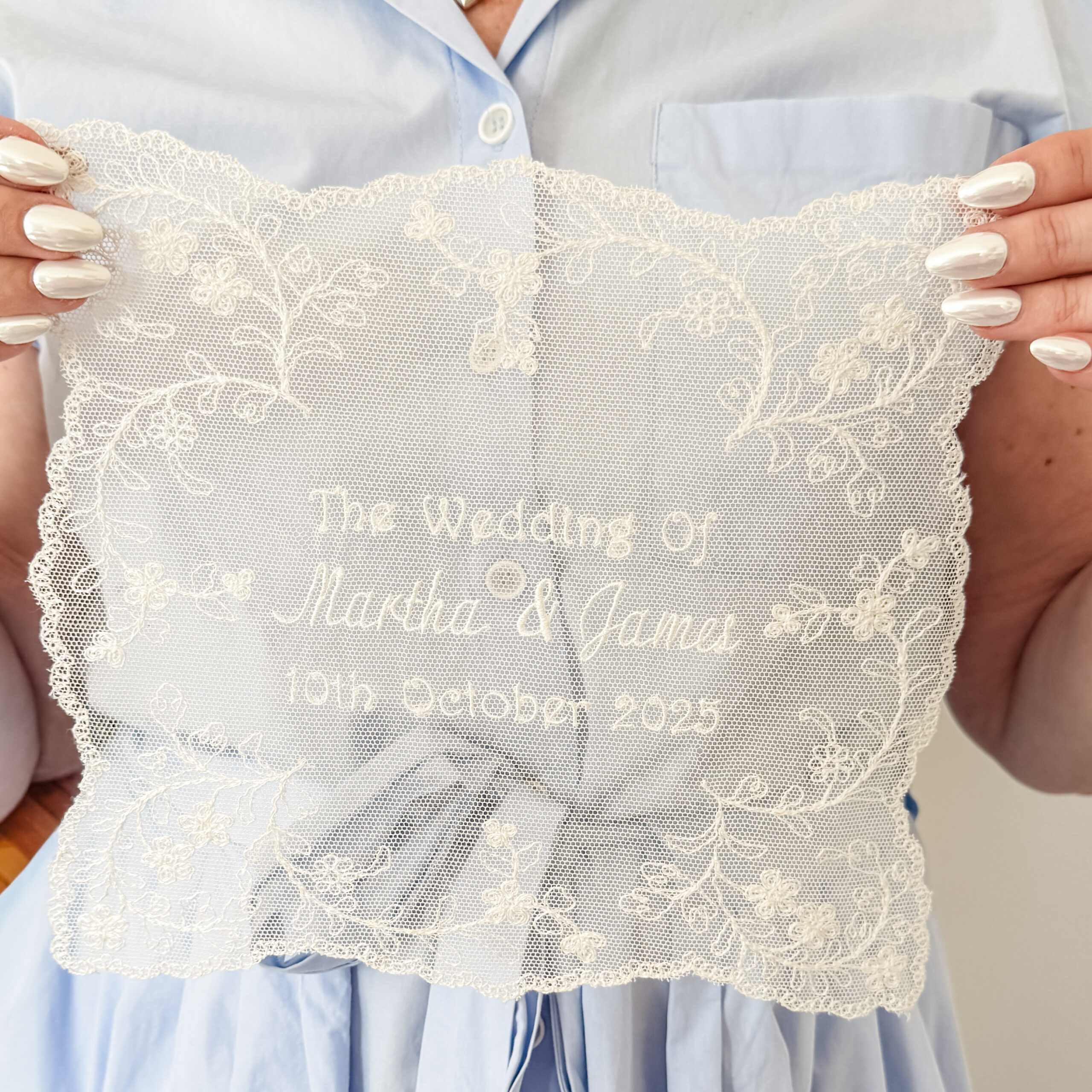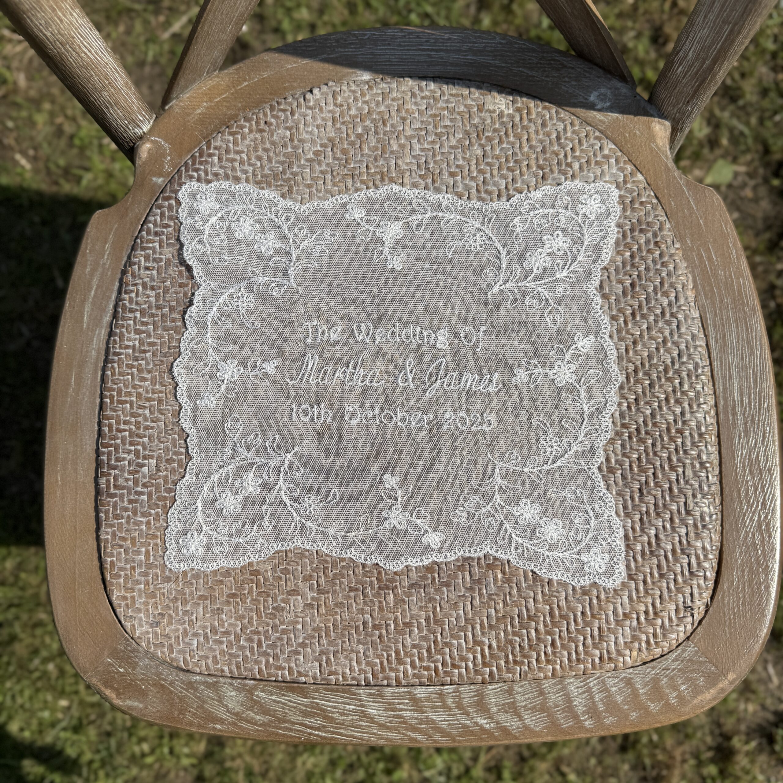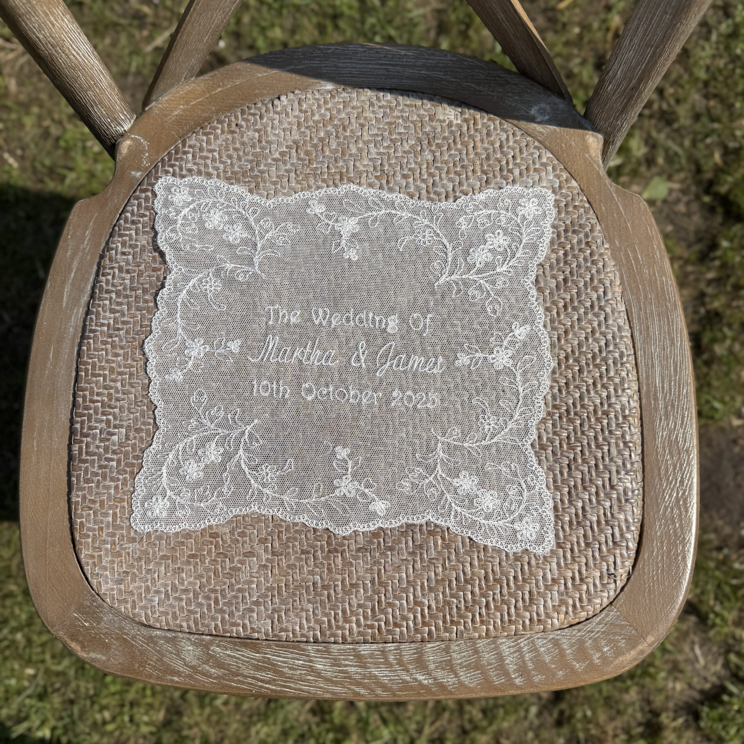 Each piece is custom embroidered in our Nottingham studio with your personalised wording – whether it’s the couple’s names, a monogram, wedding date, or venue details. You can choose from a selection of elegant fonts and embroidery colours to perfectly reflect your wedding style.