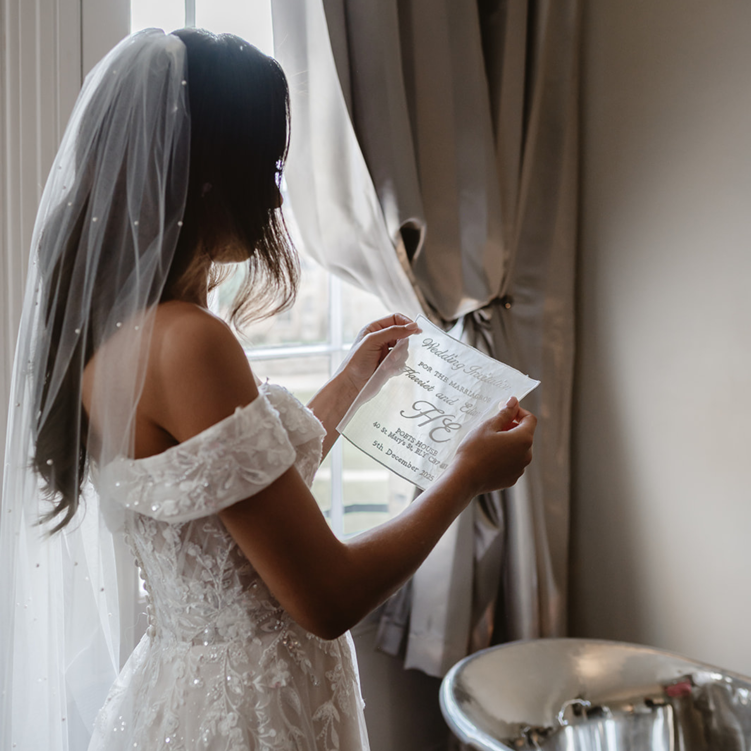 Each piece is handmade in our Nottingham studio and finished with your choice of font and embroidery colour, making every invitation completely unique.