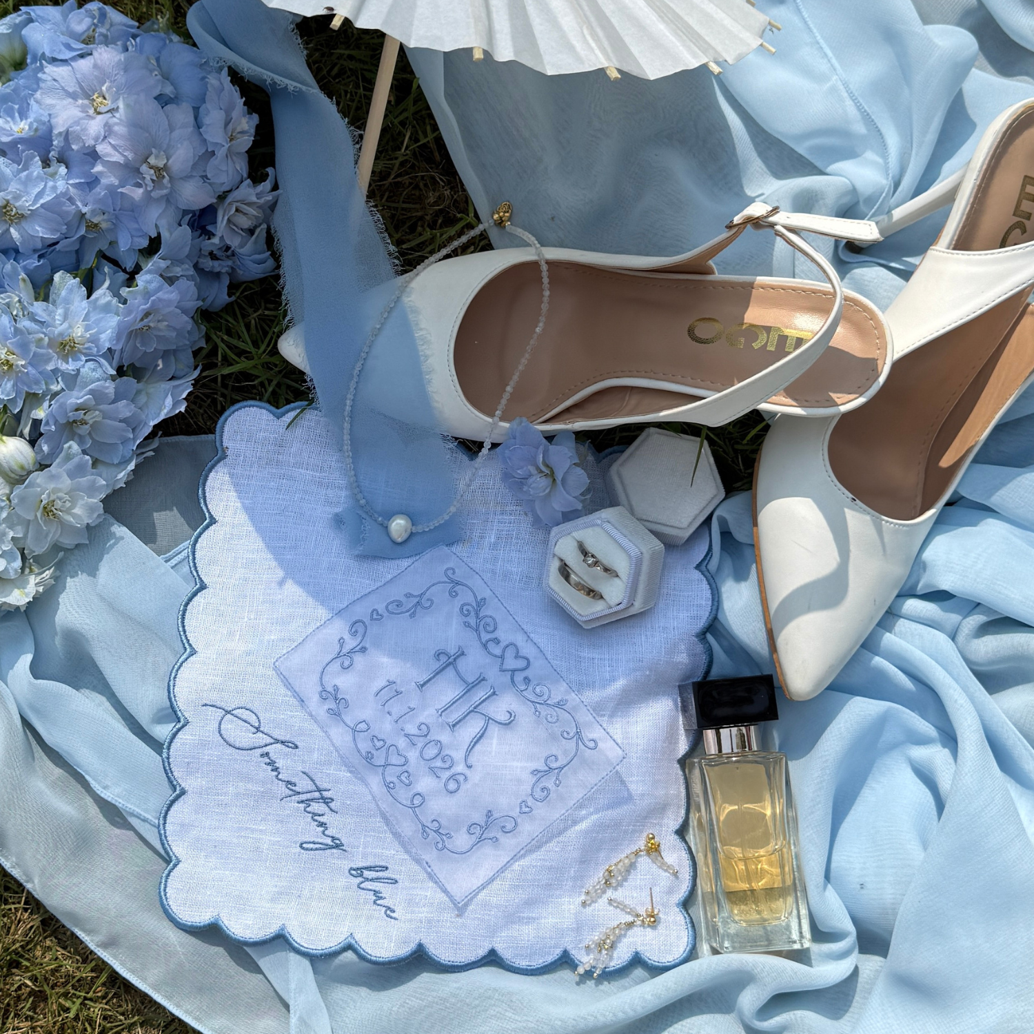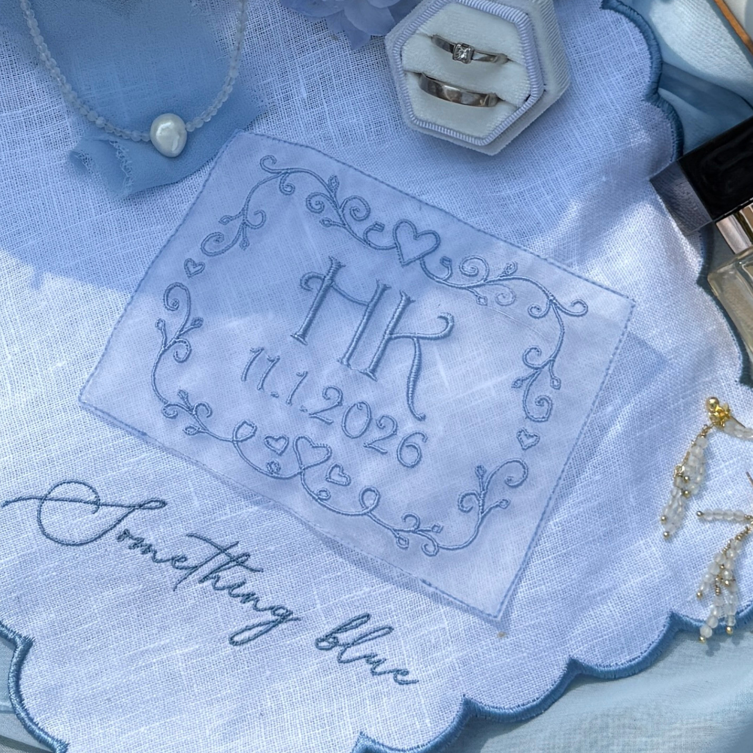Silk organza wedding dress label is a lovely sentimental way to have a discreet something blue inside your bridal gown. Our personalised dress patch can be hand sewn inside your dress.